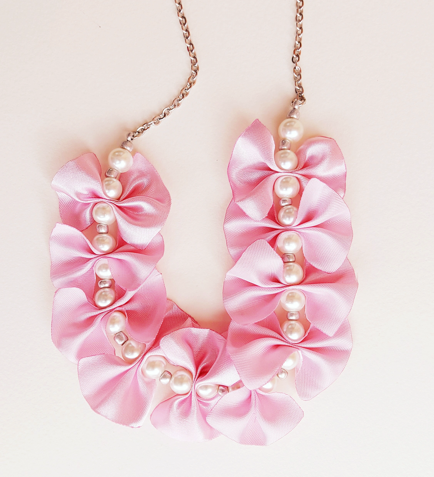 Collana tessile composta da perle bianche/panna e perline, tessuto satin arricciato. Chiusura con catena e moschettone in acciaio inossidabile.