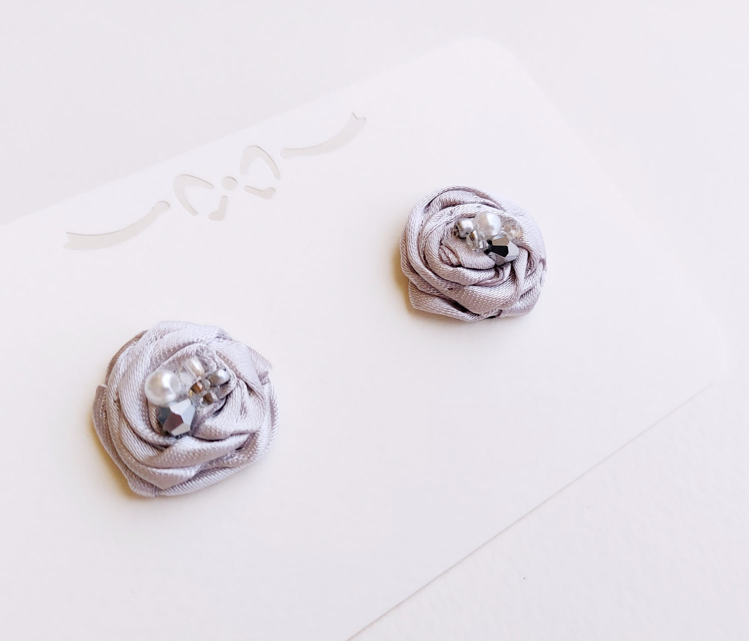 Orecchini realizzati con tessuto satinato e perline ricamate a mano.